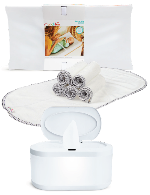 Pair it with Munchkin Waterproof Changing Liners for an added layer of protection, and add Munchkin’s Touch-Free Wipe Warmer to keep the cold off of little tushies. You can also create a caddy of changing essentials, including diaper cream, diaper disposal bags, an extra sleeper, hand sanitizer etc. so everything you need is within reach.